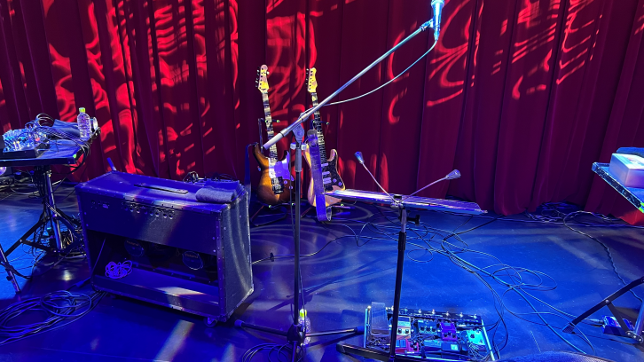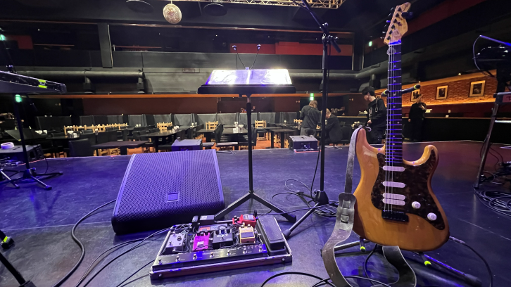 アンプって普通は客席側に向けるんだけどここはステージと客席が近すぎてアンプの音が小さい自分の場合でもお客さんにボーカルが聞こえないほどギターの音が届いてしまうかも、というワケでやってみようということで。