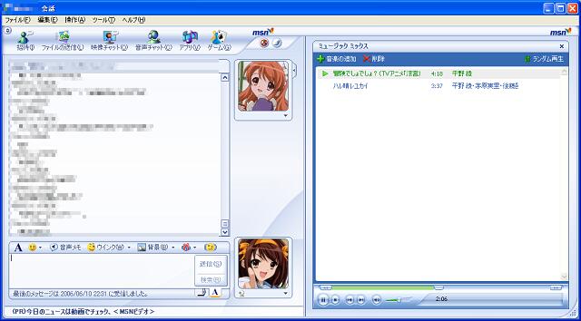 久しぶりにMSNメッセンジャーを入れて知人とお話してました。 どれくらい久しぶりかというと、登録してた自分のメアドとパスを忘れてたぐらいです。 しかしまぁなんか色々と便利になってたようで。 特に上の画面のミュージックボックスはかなり良いですね。 お互いが持ってる音楽ファイルを登録して流す事ができます。 ファッキン著作権!って感じでしょーかね。 おもしれぇ、おもしれぇ、とばかりに互いの音楽ファイルを登録して聴き合ってまして、最初の方は比較的ナウい(死語)曲を聴いていたのですが、登録する曲の数が増えるにつれ・・、