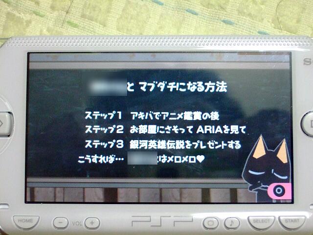 こんなアレな言葉でもポケピ達が一生懸命覚えようとノートに書く姿は見てて萌えますわ。(*´ω`*)ゴメンネ、変態な先生で 今作はプレイヤーが教えるだけじゃなく、Infoseekのニュースサイトと連動し、その記事から言葉を学ばせることも可能になりました。 これが結構面白く、時事ネタを言葉にするポケピ達は見てるだけで楽しめます。 ただこの機能は当たり前ですが、インターネットに接続できるワイヤレス環境が無いと使えないってのが難点でしょうかね。 職場は接続機器に制限かけられてるし、朝の内にDLしてから出かけないとダメですね。 ホットスポットと契約でもしようかな。(職場のすぐ近くにアクセスポイントが有る) 2Gのメモリースティックを買った理由は後にも先にもやっぱり動画ですよ。 ええ、キモく言うならPSPでアニメ見てニヤニヤしたいんだよコンチクショウめって感じですよ。
