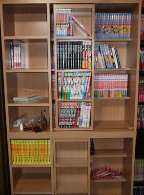 手前スライド式のヤツを買ったのですが、奥の棚に入れられるのが少年or少女コミックサイズ、いわゆる新書判のしか入らない罠。 ヤング誌系のコミック(B6?)サイズのを入れると奥行きが足りなくて、手前のスライド棚がひっかかっちゃうよ、ママン。or2 毎月着実に増えていくコミック。 既存の本棚は既に満タンで、ここ1年程に出てたコミックはほとんど床や机の上に平積みにするしかなく、この状況を打開すべく思い切って本棚を増設しました。 親には呆れた顔で「古本屋でもやるのか。」言われましたが、いやいやいや…。 「やるならメイド漫画喫茶だよ。(^ω^)」と言い返してやりました。 ええ、嘘ですが。 しかし困った事に自分の持ってる漫画って、B6サイズのが圧倒的に多いんですよねぇ。 手前の棚には入れる事ができるんですけど奥の棚には入りません。 とりあえずジョジョとかガラスの仮面とか、その他奥に入れられるサイズのを移してみましたが、ご覧の通り奥はまだまだガラガラです。 少年コミックサイズで今後増えてくのが見えてるのはペンギン娘ぐらいで、あとはみんなヤング誌系ばかり。(^ω^; しかし本棚せっかく買ったんだし、使わず空けたままにしておくのも勿体ないので…、