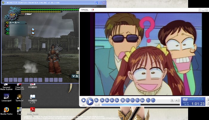 しかし今週の画質というか、インタレ解除がおかしいですよ、BIGLOBEさん。 キャラの輪郭とかギザギザですよ。 まぁ、無料(タダ)で見せてもらってるんだから、いいんですけどね!(*´∀`)b 見ててちょっぴり気にはなりますが、昔ほど画質に対するアツい(キモい)想いは無くなってますね。 クロスカラー、ドット妨害、ドンと来い。(*゚∀゚)=3 今日はモンハンをちょろっとやったり、何気に発売日に買ってたPSPのガンダム バトルクロニクルをやったり、アニメ消化をしたりしてました。 モンハン。