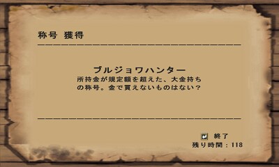 名前で言うなら黒滅龍剣と、勝利と栄光の勇弓です。 生産とアップグレード代、併せて70万ゼニー消費。 黒滅龍剣、龍属性600を持つ片手剣。 なんか下手な双剣使うより強いです。 黒滅、黒槍、ゲイヴォルガ、ミラバスタの構成でもアカムを針5分で倒せました。 ガードもできるし、アカムには双剣で行くよりこっちのが全然楽ですね。 勝利と栄光の勇弓、数値上は龍属性弓の中で最強ですが、瓶類が一切使えないので 総合的に見たら覇弓のが強い気がしないでもないですが、 「ワタクシ、HR91以上ですのよ、オホホホッ。」とアピールしたいが為に作りました。(ぁ ガンダム バトルクロニクル。 カプコンのVSシリーズライクなアクションゲーム。 慣れるとVSシリーズよりこっちのがMS操作は楽しいですね。 ただグラフィック面ではVSシリーズのがデキはいいかな。なんかこっちってガンプラって感じ。 プレイ時間39時間にしてやっとこさ全勢力でSランク以上達成できました。 とりあえずこのゲーム、CPU戦はキュベレイが最強でFAですかね。 敵をロックオンしなくても、適当に飛び回りながらビームとSPAだけやってれば勝ってしまう反則紛いな強さ。 とりあえずMSチューン限界解除できるようになったので、あとはお気に入りのMSを最強にして職場の人と一緒に遊ぶだけかなぁ。 この超高速に動き回るグフを見せてあげたいものです。 今期のアニメ、いくつか録画しましたが、けっきょく見てると言えるのはガンダムとクラナドとナイトウィザードぐらいかな。 逮捕しちゃうぞ、シャナU、レンタルマギカは録画し続けてはいるもののHDレコーダ内で肥やしになってます。 おわひ |