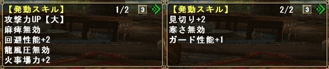 金剛装備って古龍系の中で一番不人気なのか、防具一式見るのはこれが初めてかも。 ![]() パっと目地味だし、古龍装備のクセに火と雷に大きなマイナス耐性が付いてるのがネックなんでしょうね。 しかし発動スキルに耳栓・耐震・ガード性能+1が漏れなく付いてくるのでラージャンを始め牙獣種を相手にするには最適の防具に思えます。 火玉さえ気をつければヴォルガノス戦にも良いです。 アイテム使用強化スキルも発動するので、ヴォルガノスやシェンガオレン戦においてはクーラや強走Gの効果時間が長くなるのでそういった面でも楽チンです。 ただやっぱり火玉を喰らうと笑えるぐらいHP減るので、そこだけ注意ですねぇ。 あとオマケで千里眼も発動。 モンスの移動パターンが知れ渡ってる今、あまり必要ないスキルですが。 ![]() 火事場ガンナー用にクロオビSヘルムも作りました。 ノーマルラオ一式だと友情スキル発動しないので、底力が付いてるS装備で、尚且つ見た目もなるべく損なわないのを探したらコレしかなかったもので。 ラオ装備といえば、